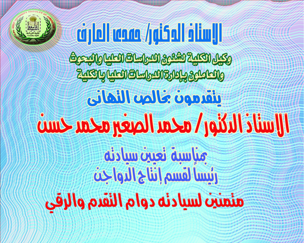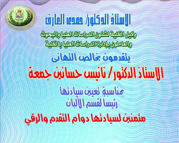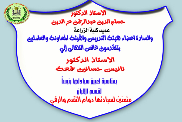 تهنئة عميد الكلية لتعيين رئيس قسم الألبان Read more about تهنئة عميد الكلية لتعيين رئيس قسم الألبان تهنئة عميد الكلية لتعيين رئيس قسم الألبان 13 يوليو 2017