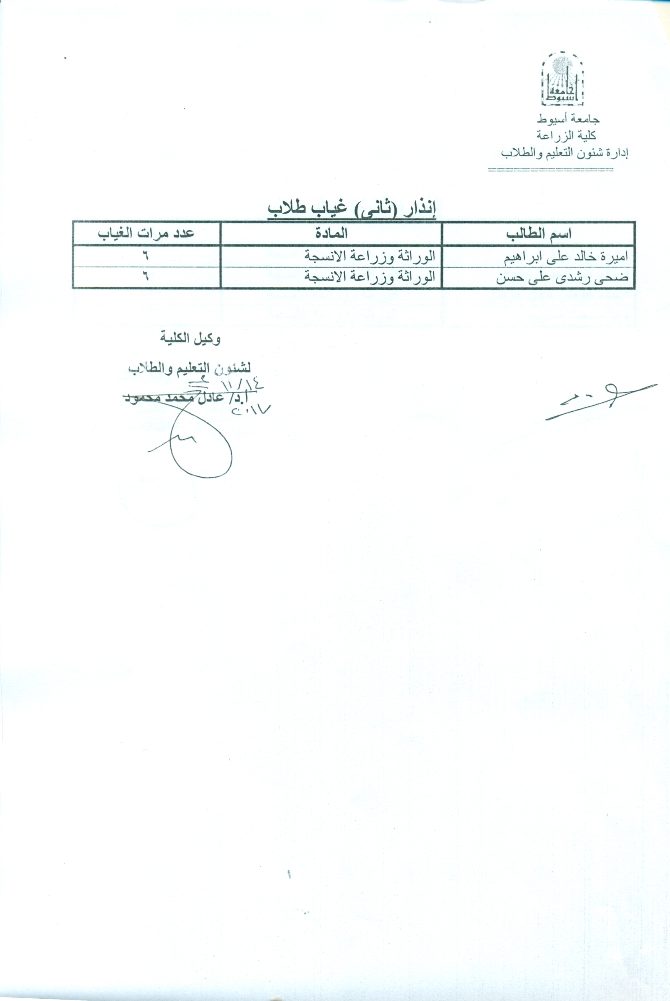 الإنذار الثانى لغياب الطلاب الاتى أسمائهم فى مادة الوراثة وزراعة الانسجة