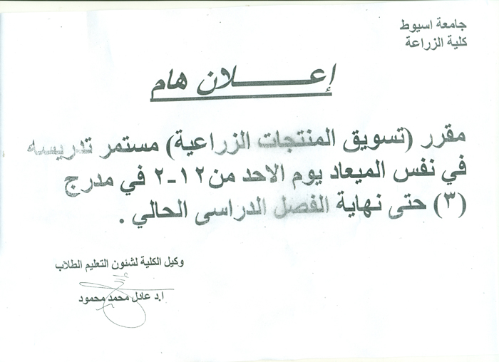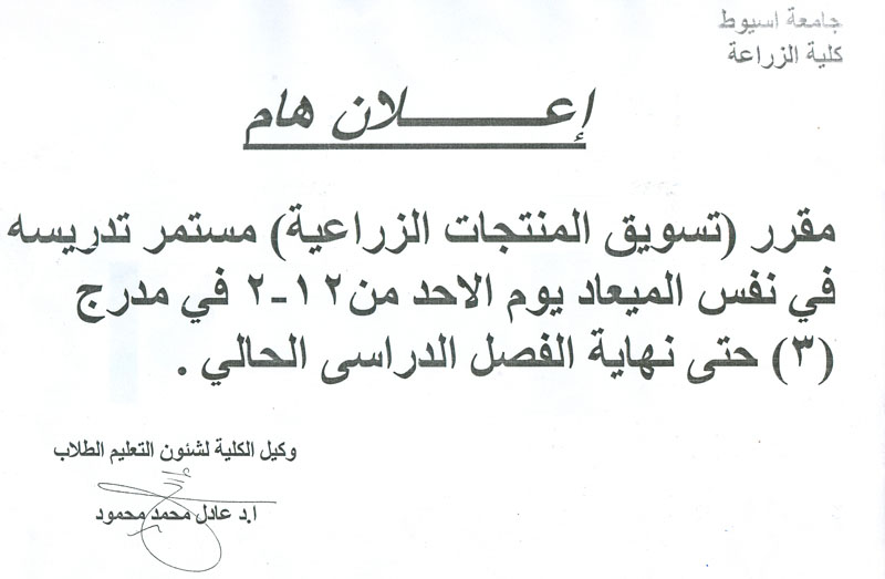 سيتم بمشيئة الله تعالى عقد الامتحان التأهيلي للطالب / بسام فكرى جلال طالب الدراسات العليا المسجل لدرجة الدكتوراه بقسم وقاية نبات - بالكلية وذلك فى تمام الساعة الواحدة ظهراُ يوم الأثنين الموافق 20/11/2017 بقاعة مجلس القسم.