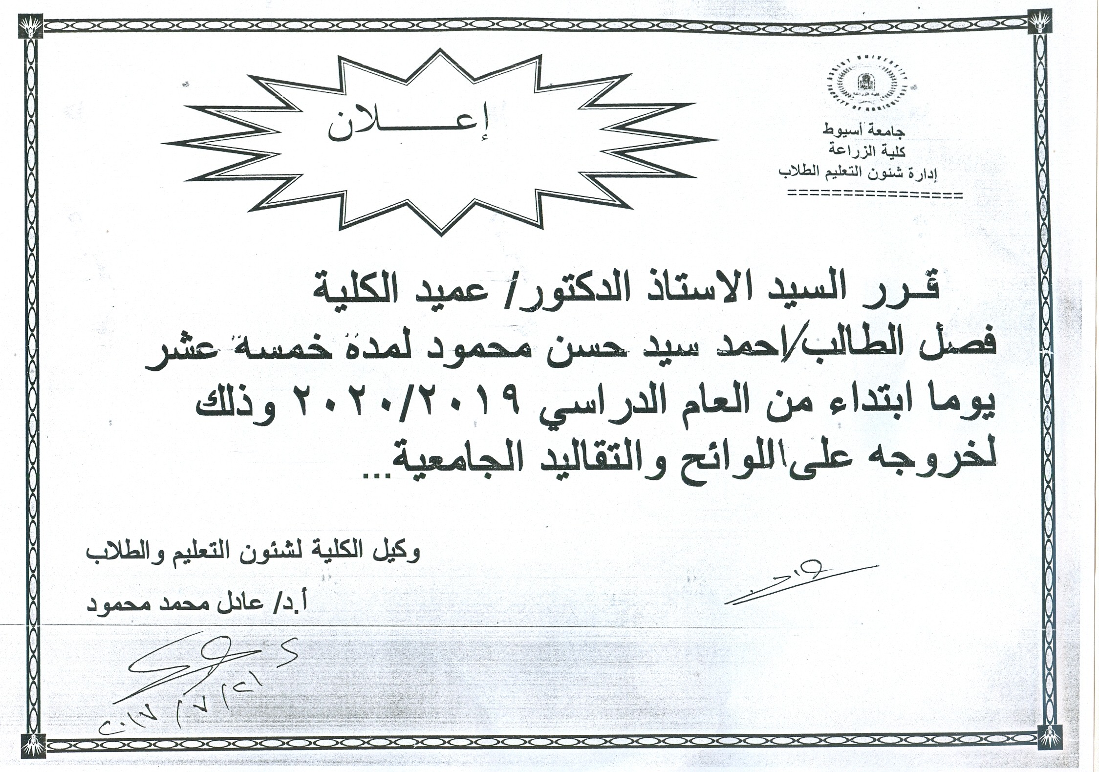 فصل الطالب/ احمد سيد حسن محمود لمدة 15 يوم Read more about فصل الطالب/ احمد سيد حسن محمود لمدة 15 يوم فصل الطالب/ احمد سيد حسن محمود لمدة 15 يوم 22 يوليو 2019