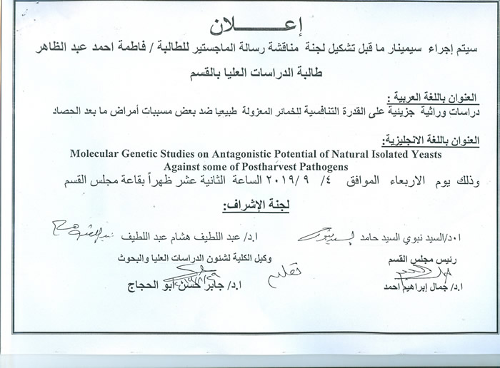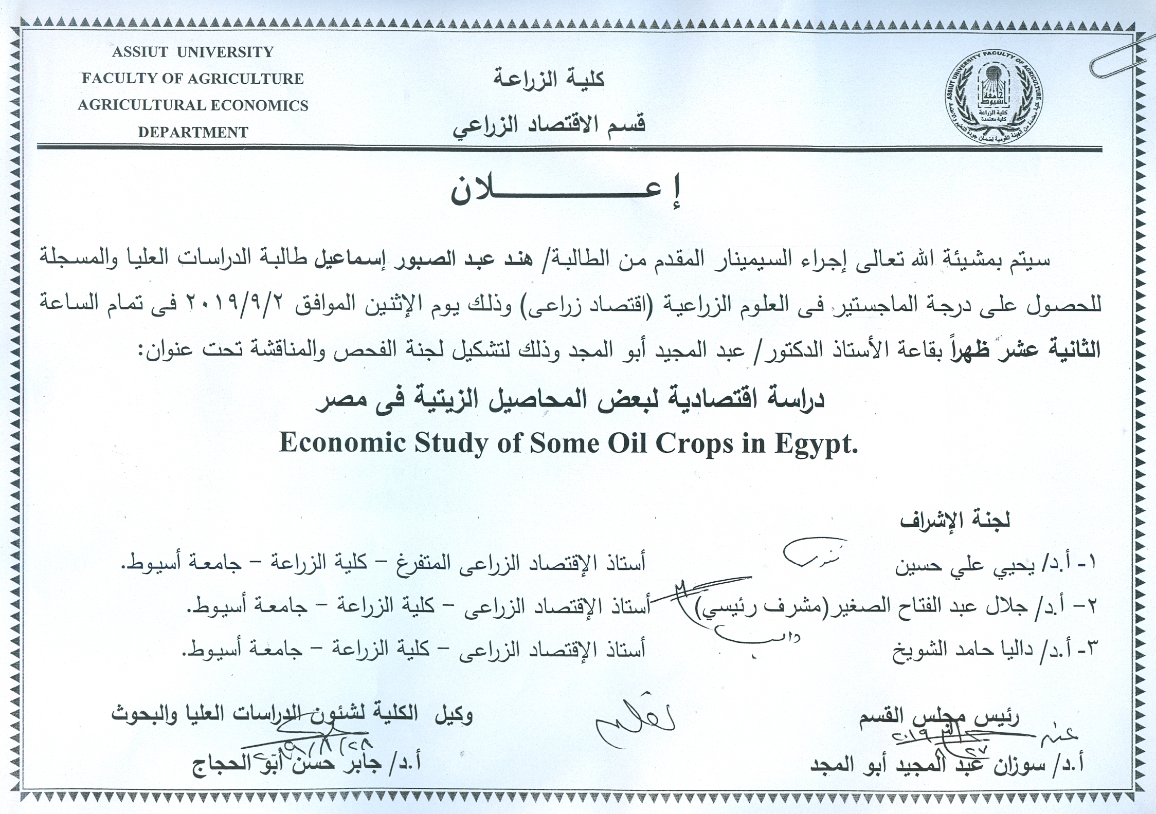 • عقداجتماع لجنة شئون التعليم والطلاب بكلية الزراعة يوم الإثنين الموافق 9-9-2019م.