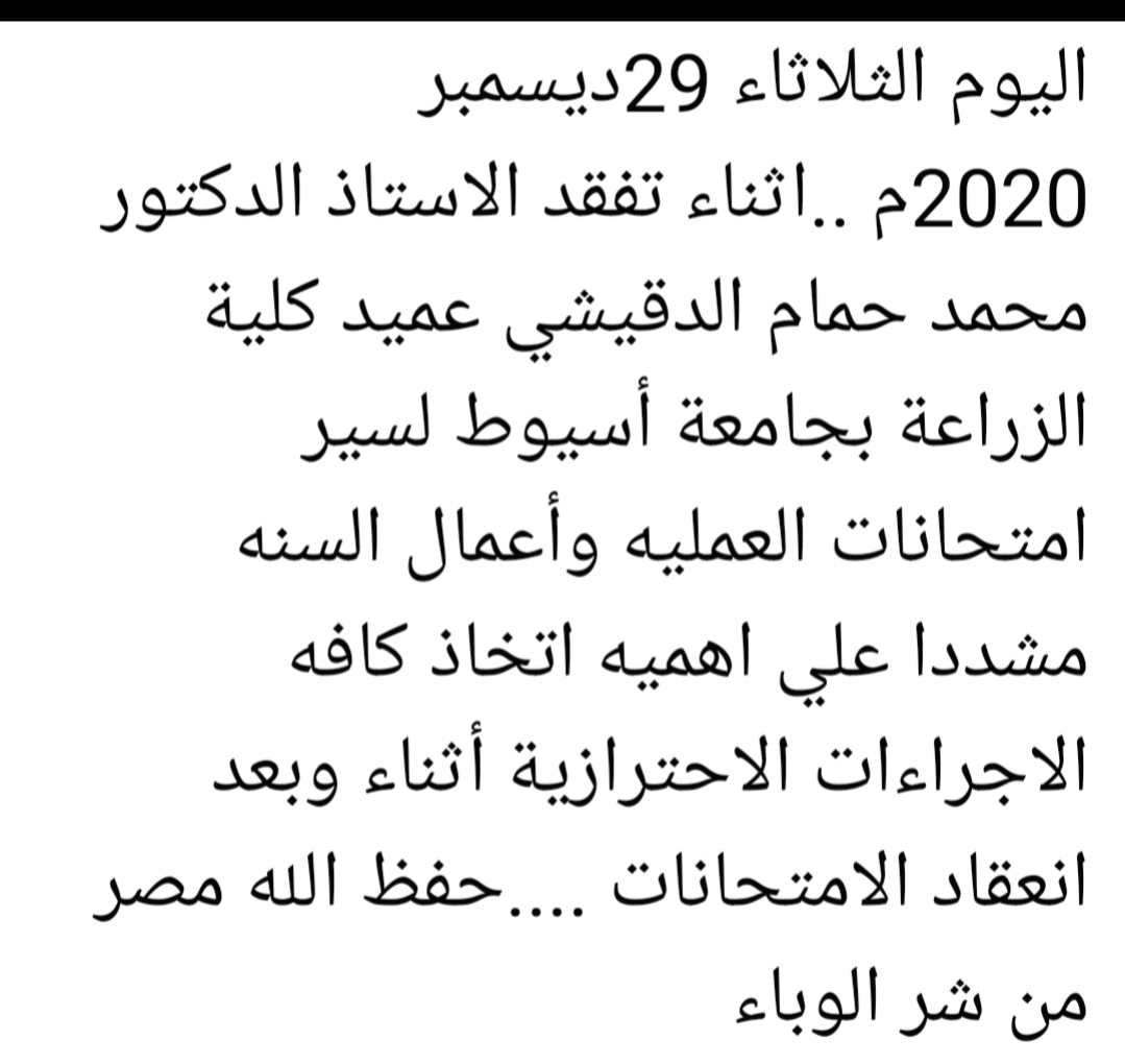 ومن جانبه أشار الدكتور شحاتة غريب إلى اتخاذ قطاع شئون التعليم و الطلاب كافة الإجراءات الاحترازية و الوقائية استعداداَ لانطلاق امتحانات الفصل الدراسي الأول للعام الجامعي 2020/2021 والتي تشمل تعقيم و تطهير كافة لجان الامتحانات و تقليل أعداد الطلاب الممتحنين داخل اللجان و مراعاة المسافات التباعدية و توافر أكثر من 28 جهاز قياس الحرارة و الماسكات و تواجد الأطقم الطبية داخل اللجان و جيل التعقيم و و إلغاء جميع الإعفاءات من أعمال المراقبة و الملاحظة كما تم التنسيق مع اتحاد طلاب الجامعة لتشكيل فرق طلابية لتواجد خارج صالات الامتحانات و على البوابات الرئيسة لمتابعة الإجراءات الاحترازية للطلاب قبل و بعد أدائهم للامتحانات وتوفير وتوزيع الماسكات و جيل التعقيم و قياس الحرارة لهم.