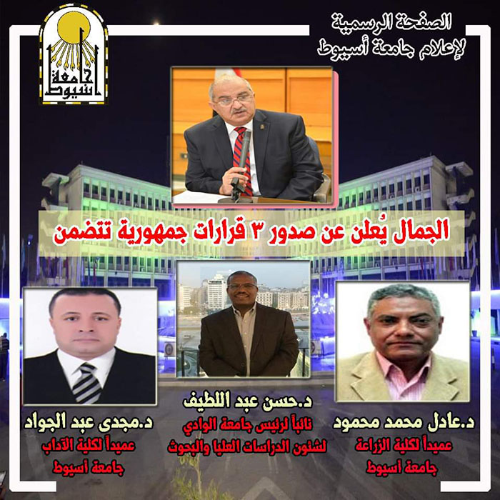 تتقدم أسرة كلية الزراعة جامعة أسيوط بخالص الشكر والتقدير والاحترام وذلك لمعالي السيد الاستاذ الدكتور / محمد حمام زين العابدين الدقيشي عميد كلية الزراعة السابق علي ما قدمه خلال فترة عمادة الكلية