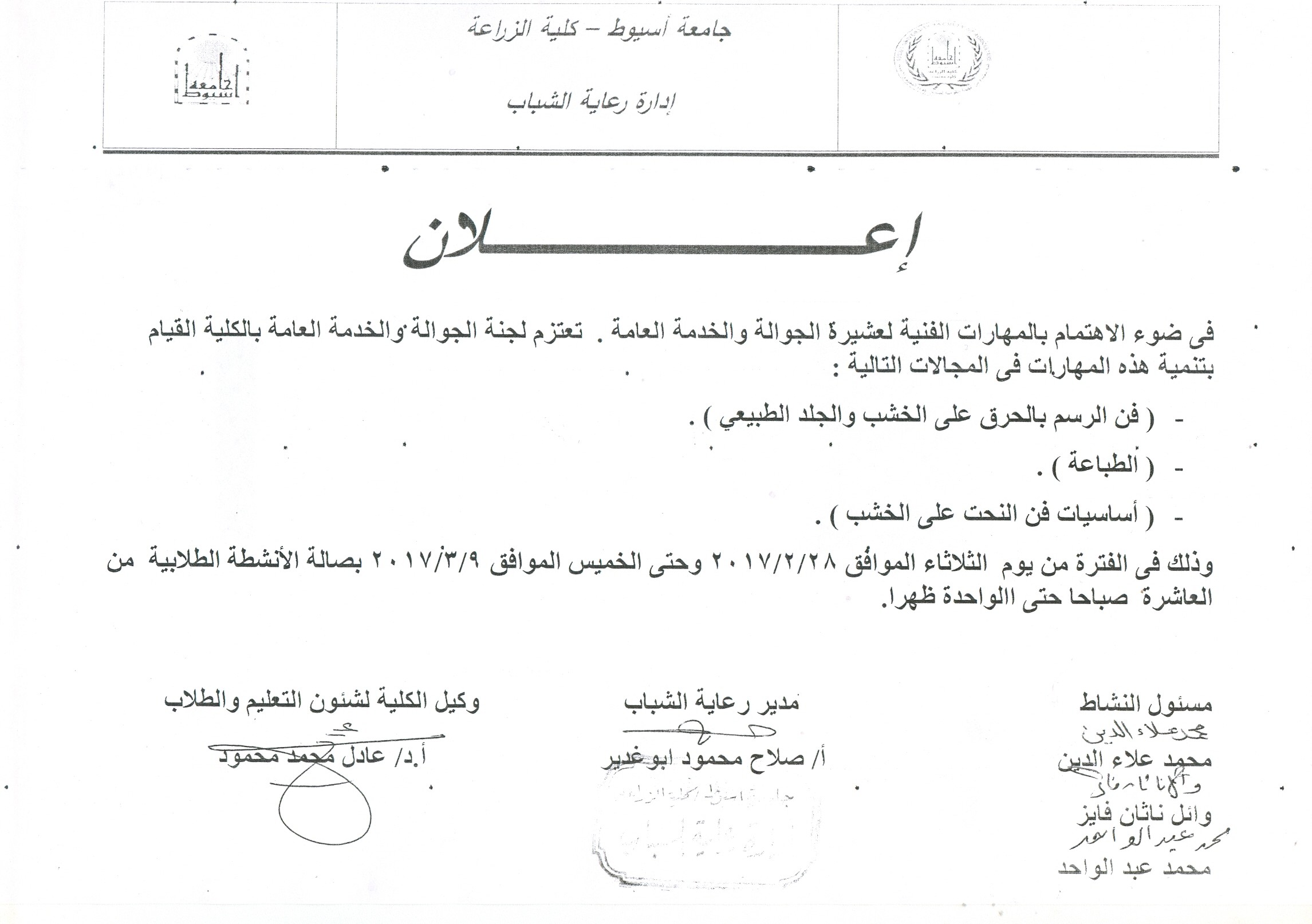 نشاط عشيرة الجوالة والخدمة العامة 26 فبراير 2017 تعتزم لجنة الجوالة والخدمة العامة القيام بتنمية بعض مهارات الطلاب وذلك خلال الفترة من الثلاثاء 28/2/2017 حتى الخميس الموافق 9/3/2017 بصالة الأنشطة الطلابية من العاشرة صباحا حتى الواحدة ظهرا
