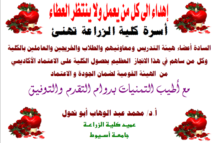 تهنئة لأسرة كلية الزراعة 26 مايو 2013 حصلت كلية الزراعة على الإعتماد الأكاديمي من الهيئة القومية لضمان الجودة و الإعتماد مع أطيب التمنيات بدوام التوفيق