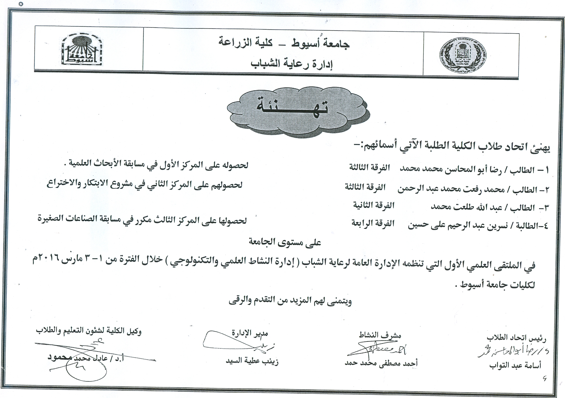 تهنئة للطلاب الحاصلين على مراكز فى الملتقى العلمى الأول 7 مارس 2016 تهنئة للطلاب الحاصلين على مراكز فى الملتقى العلمى الأول