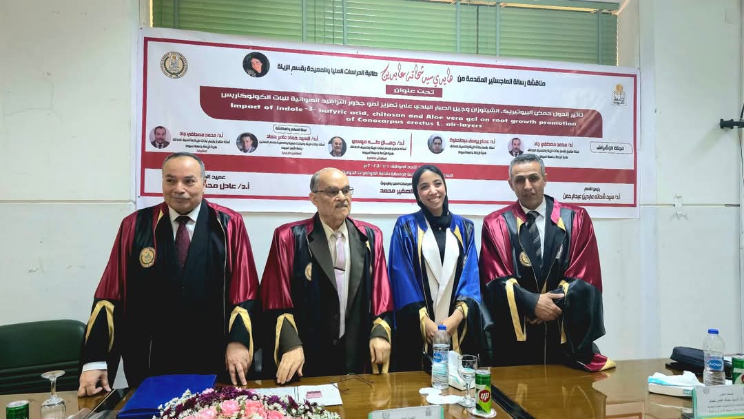 تم مناقشة رسالة الماجستير المقدمة من المعيدة / هايدي سيد شحاتة عابدين طالب الدراسات العليا بقسم نباتات الزينة وتنسيق الحدائق، كلية الزراعة ، جامعة أسيوط