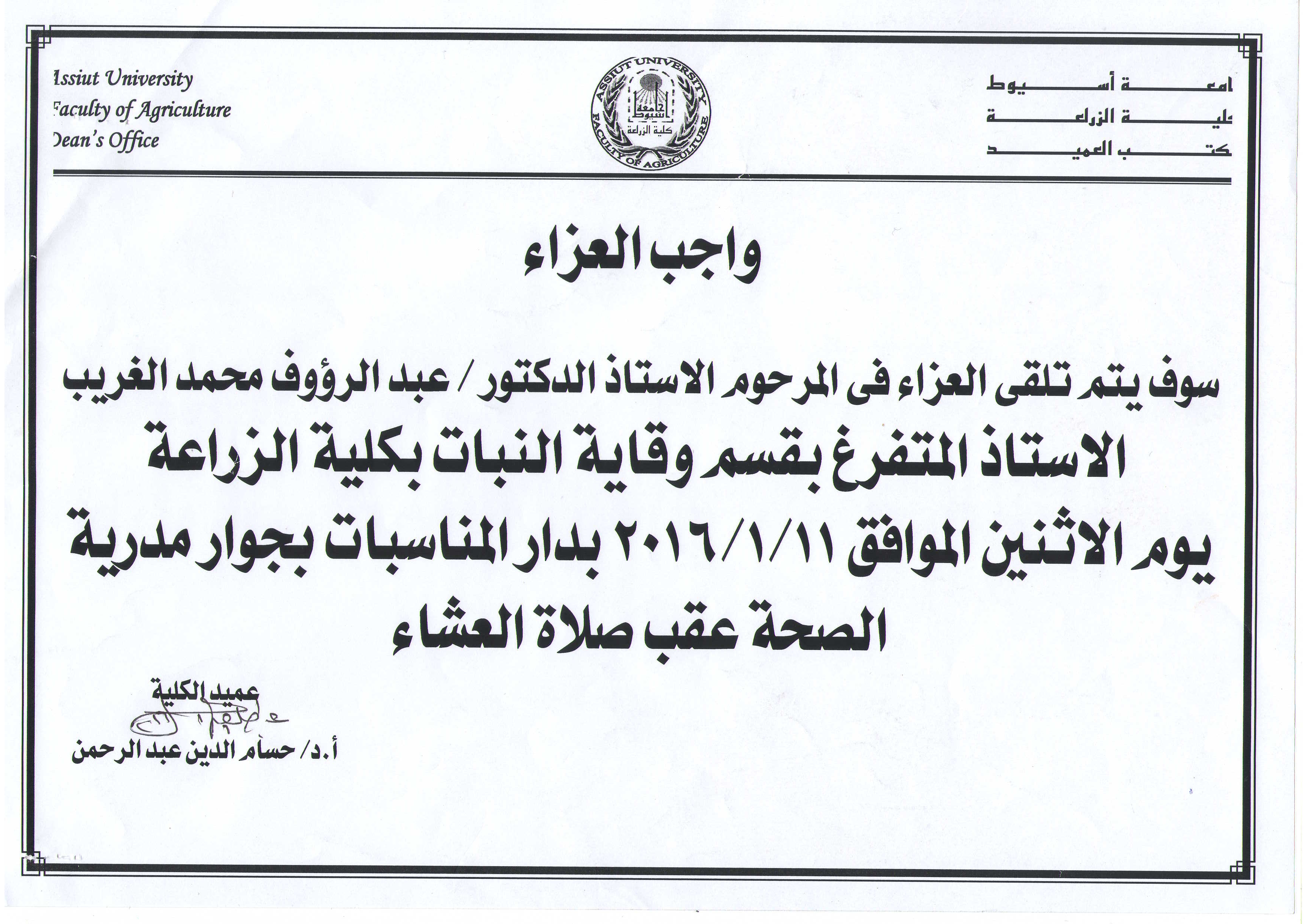 الاستاذ المتفرغ بقسم وقاية النبات بكلية الزراعة وذلك يوم الاثنين الموافق 2016/1/11