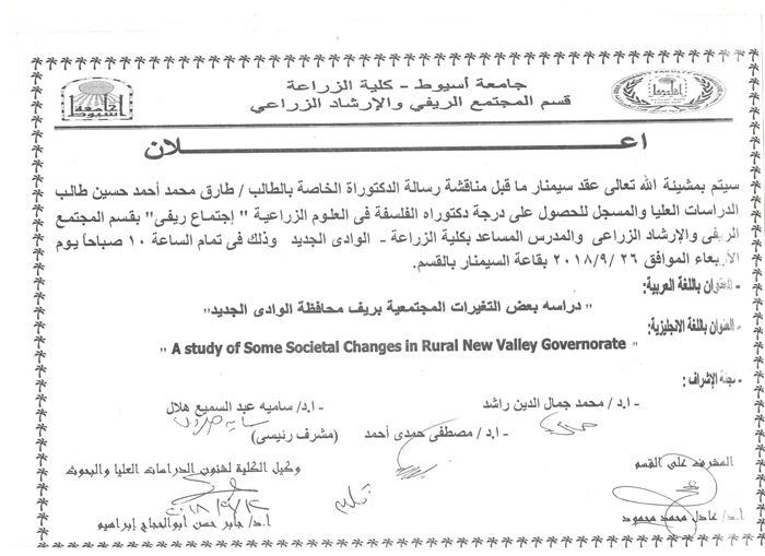 The date of the Semanar contract before discussing the doctoral thesis of the student/Tarek Mohamed 25 September 2018 The date of the Semanar contract before discussing the doctoral thesis of the student/Tarek Mohamed