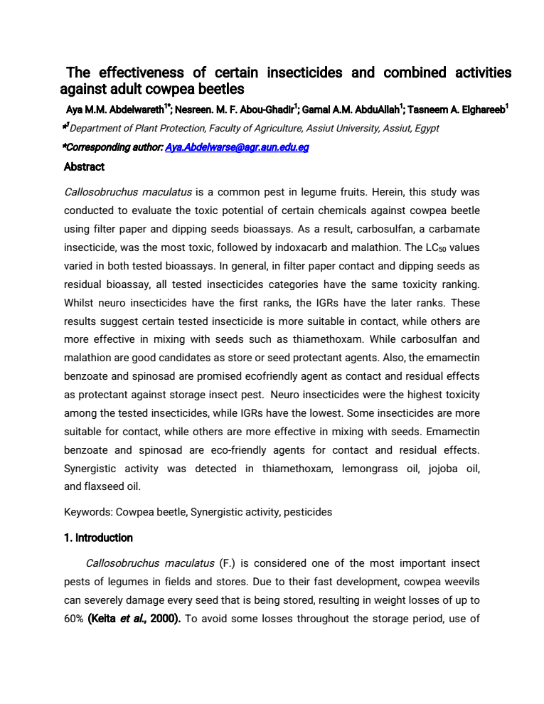 Callosobruchus maculatus is a common pest in legume fruits. Herein, this study was conducted to evaluate the toxic potential of certain chemicals against cowpea beetle using filter paper and dipping seeds bioassays. As a result, carbosulfan, a carbamate insecticide, was the most toxic, followed by indoxacarb and malathion. The LC50 values varied in both tested bioassays. In general, in filter paper contact and dipping seeds as