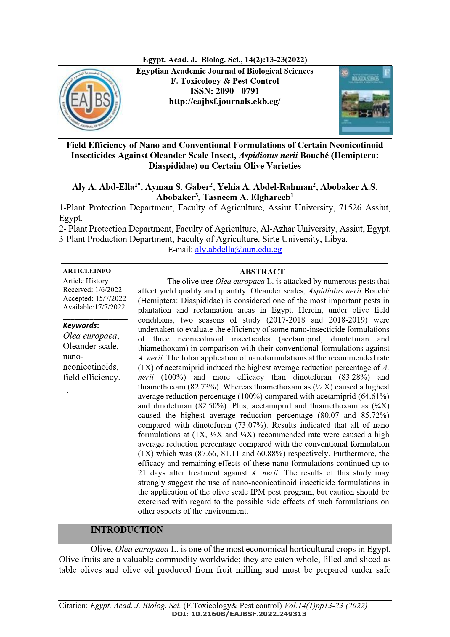 plantation and reclamation areas in Egypt. Herein, under olive field conditions, two seasons of study (2017-2018 and 2018-2019) were undertaken to evaluate the efficiency of some nano-insecticide formulations