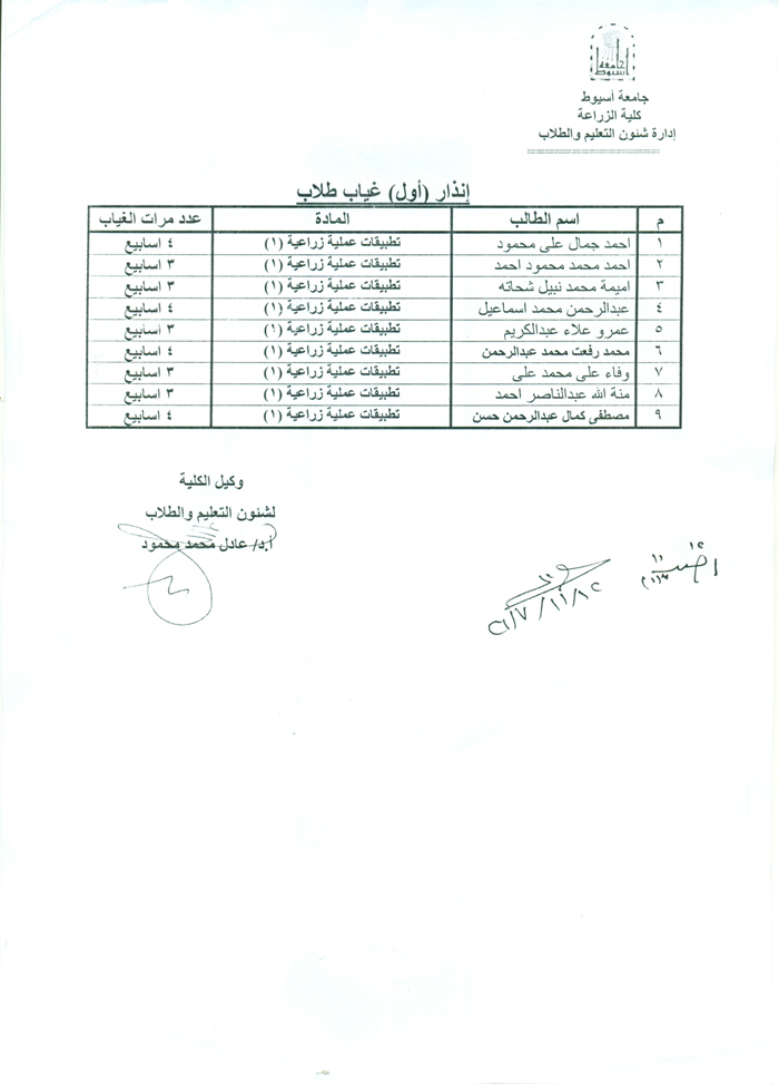 First warning of the absence of students whose names 12 November 2017 First warning of the absence of students whose names