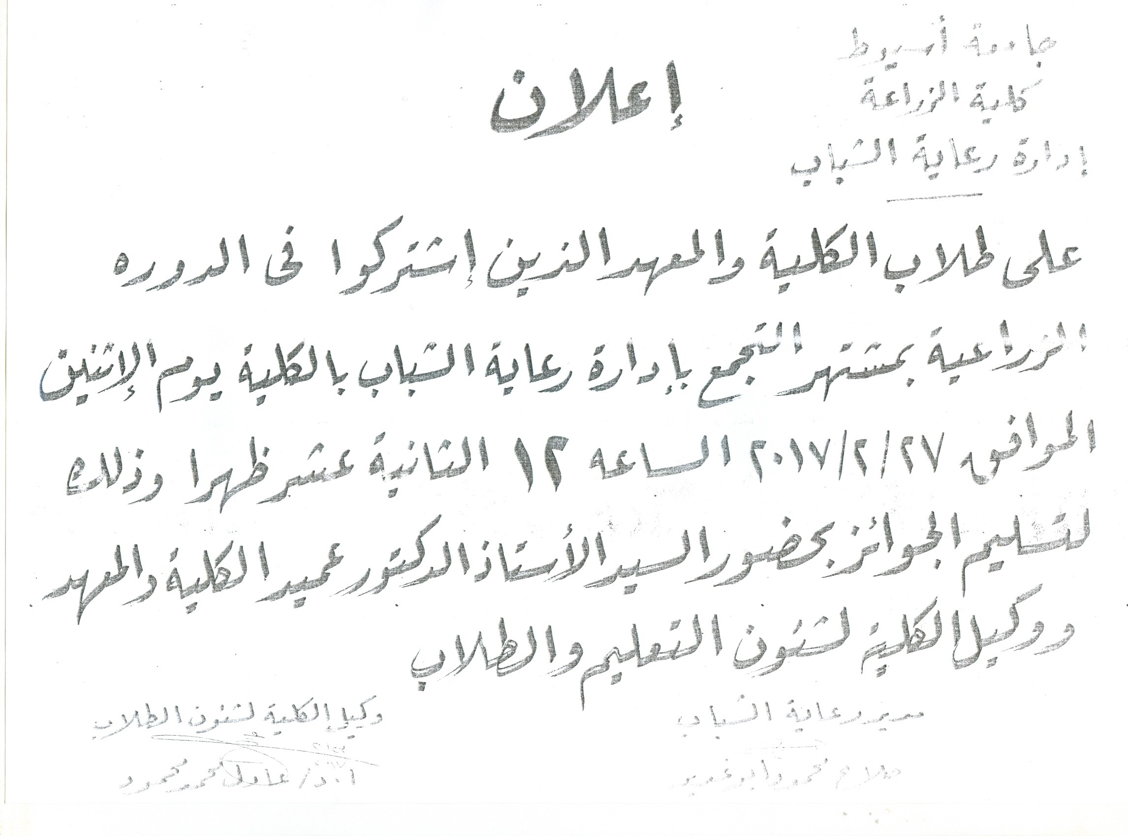 The Youth Welfare Department announces of honor students in current agricultural cycle on Monday 27/2/2017 at 12 noon in the presence of Dr Dean Professor Dean of the higher Institute for cooperation, extension Professor Vice Dean for something.