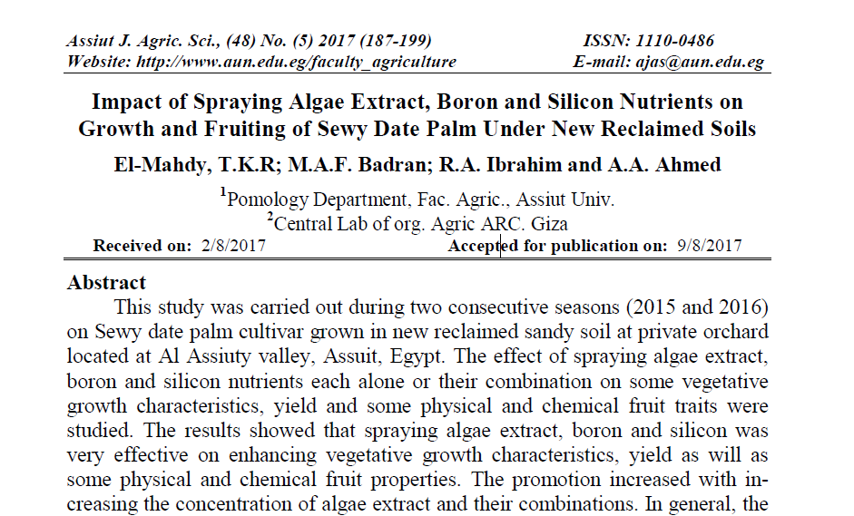 Impact of Spraying Algae Extract, Boron and Silicon Nutrients on Growth and Fruiting of Sewy Date Palm Under New Reclaimed Soils