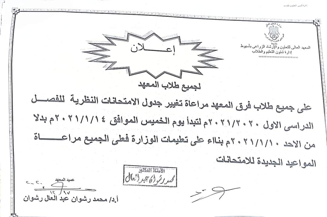 Important information for students of the Higher Institute for Agricultural Cooperation and Extension The schedule of theoretical examinations for the first semester 2020-2021 has been changed to start on Thursday 1/14/2021 instead of Sunday 10/12021