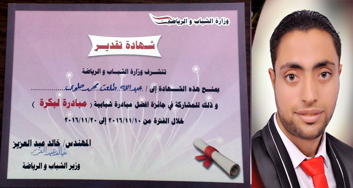 افضل مبادرة شبابية - الطالب/ عبدالله طلعت 1 ديسمبر 2016 حصل الطالب/ عبدالله طلعت محمد - من خلال المشاركة مع فريق الكلية - علىالمركز الثانى كأفضل مبادرة شبابية التابعة لوزارة الشباب والرياضة والتى عقدت فعالياتها بمدينة شرم الشيخ خلال الفترة 10/1/2016 الى 20/11/2016