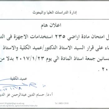 إعلان هام " تقرر تأجيل امتحان مادة أراضى 235 استخدامات الأجهزة فى التحليلات الزراعية"