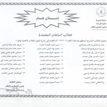 سوف يعقد بمشيئة الله تعالي اجتماع لجنة شئون التعليم والطلاب بكلية الزراعة يوم الاربعاء الموافق 16/ 11 / 2016 م الساعة الحادية عشر صباحاُ بمكتب السيد الأستاذ الدكتور/ وكيل…