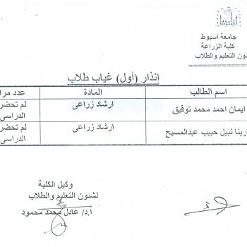 إنذار أول غياب طلاب لمادة ارشاد زراعى