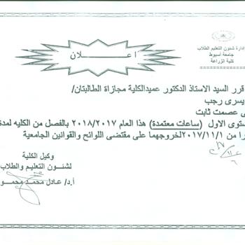 سوف يعقد بمشيئة الله تعالي أجتماع مجلس قسم الانتاج الحيوانى بكلية الزراعة يوم الاثنين الموافق 6/11/2017الساعة الثانية عشر ظهرا…