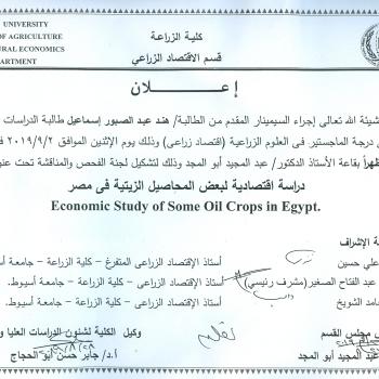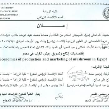 موعد عقد سيمينار تشكيل لجنة الفحص والمناقشة لرسالة ماجستير الطالب/ حمادة محمد عبدالواحد