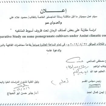 موعد عقد سيمينار ما قبل مناقشة رسالة الماجستير الطالب/ محمود علاء على