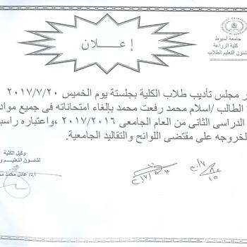 قرر مجلس تأديب طلاب الكلية بجلسته يوم الخميس 20/7/2017 مجازاة الطالب /اسلام محمد رفعت محمد بإلغاء امتحاناته فى جميع مواد الفصل الدراسي…