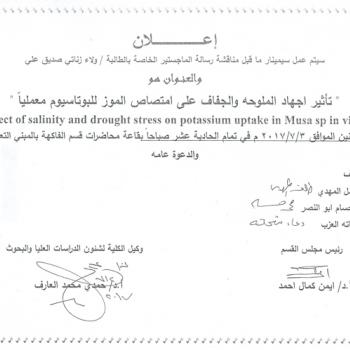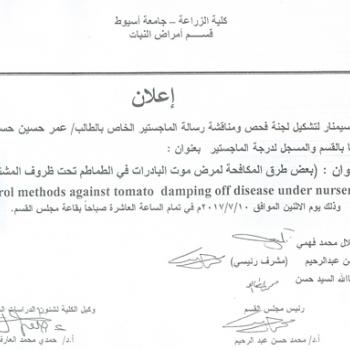 سوف يعقد بمشيئة الله تعالي أجتماع مجلس قسم أمراض نبات رقم (169) بكلية الزراعة يوم الاثنين الموافق 10/7/2017الساعة السابعه مساءا