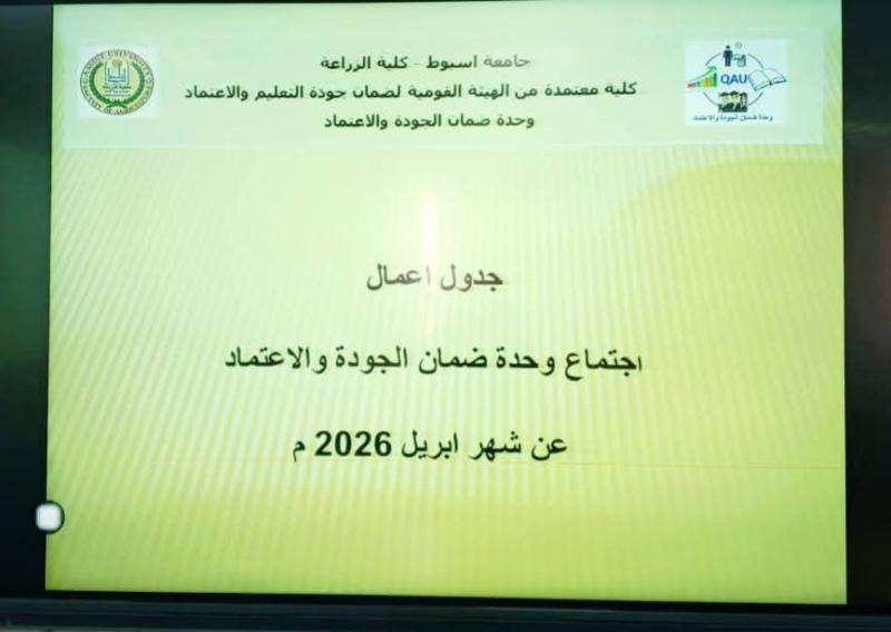 اجتمع مجلس إدارة وحدة ضمان الجودة والاعتماد بالكلية في اجتماعه الشهري لشهر ابريل لسنة ٢٠٢٦، الذي عُقد يوم الاحد الموافق ٥ ابريل ٢٠٢٦ ، برئاسة السيد الأستاذ الدكتور عادل محمد محمود عميد الكلية وبحضور كل من السيد الأستاذ الدكتور جلال عبد الفتاح الصغير وكيل الكلية لشئون خدمة المجتمع وتنمية البيئة والاستاذ الدكتور محمد الصغير محمد وكيل الكليه لشؤون الدراسات العليا والبحوث والأستاذ الدكتور عادل علي تمام وكيل الكليه لشؤون التعليم والطلاب والاستاذ الدكتور محمد حسن عبد الرحيم مدير وحدة ضمان الجودة والاعتماد بالكلية والدكتورة راندا يوسف محمد نائب مدير وحدة ضمان الجودة، بالإضافة إلى السادة أعضاء وحدة ضمان الجودة، وذلك لمناقشة جدول الأعمال