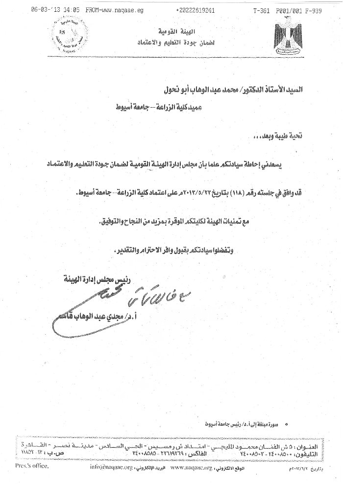 موافقة مجلس إدارة الهيئة القومية لضمان الجودة على إعتماد الكلية