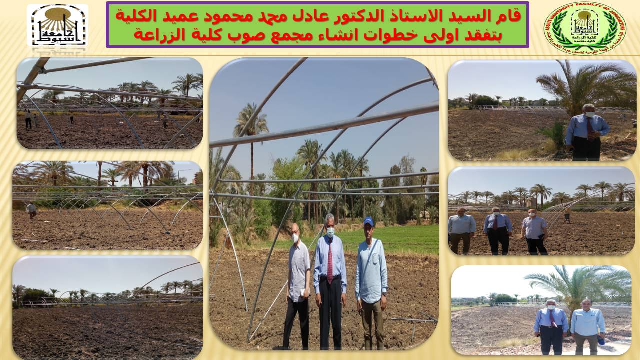 إستمرارا لتنفيذ خطة التطوير لكلية الزراعة جامعة اسيوط بمايخدم العملية التعليمية والبحثية والخدمة المجتمعية وبدعم من معالى الاستاذ الدكتور طارق الجمال رئيس الجامعة قام السيد الاستاذ الدكتور عادل محمد محمود عميد الكلية بتفقد اولى خطوات انشاء مجمع صوب كلية الزراعة فى حضور الاستاذ الدكتور اشرف جلال هريدى المشرف العلمى لمجمع الصوب . ويهدف هذا المشروع الى رفع كفاءه خريجى الكلية وزيادة منافستهم فى سوق العمل فيما يتعلق بأنتاجية محاصيل الخضر المختلفة داخل الصوب الزراعية وسوف يساهم المشروع فى رفع كفاءة استخدام المياه من خلال استخدام نظم الري الحديثة كما يقدم خدمه لمجتمع الجامعه من خلال طرح انتاجه ان شاء الله من محاصيل الخضر عالية الجودة بمنافذ البيع بالكلية.