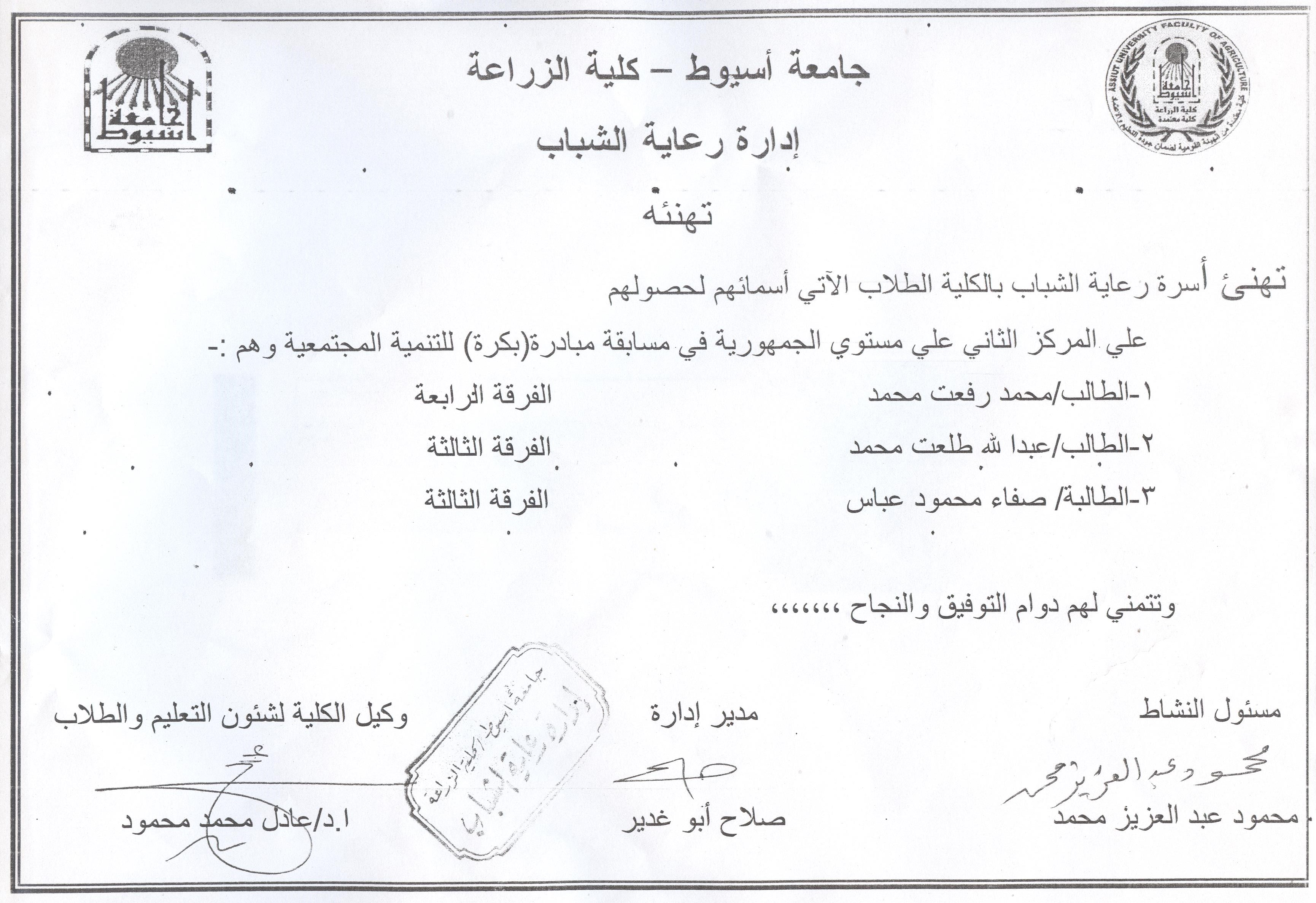 تهنئة من رعاية الشباب بالكلية