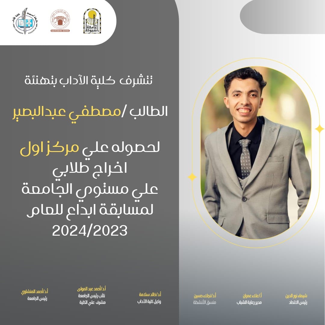 الطالب/مصطفى عبد البصير يحصل علي مركز اول اخراج طلابي علي مستوي الجامعة في مسابقه ابداع