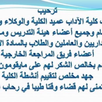 يعقد بكلية الآداب يوم الأربعاء الموافق 24/4/2013 ، مناقشة رسالة الدكتوراة المقدمة من الباحث / عبد القادر لطف قاسم الخلي - يمني الجنسية - بعنوان: