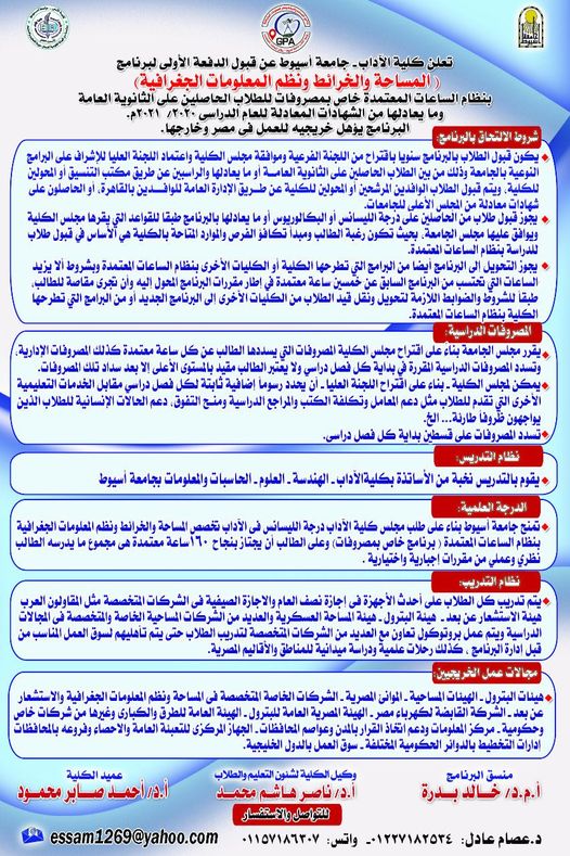 تعلن كلية الآداب عن قبول الدفعة الاولي لبرنامج المساحة والخرائط ونظم المعلومات الجغرافية بنظام الساعات المعتمدة للطلاب الحاصلين علي الثانوية العامة ومايعادلها من الشهادات الممعادلة للعام الدراسي 2020-2021