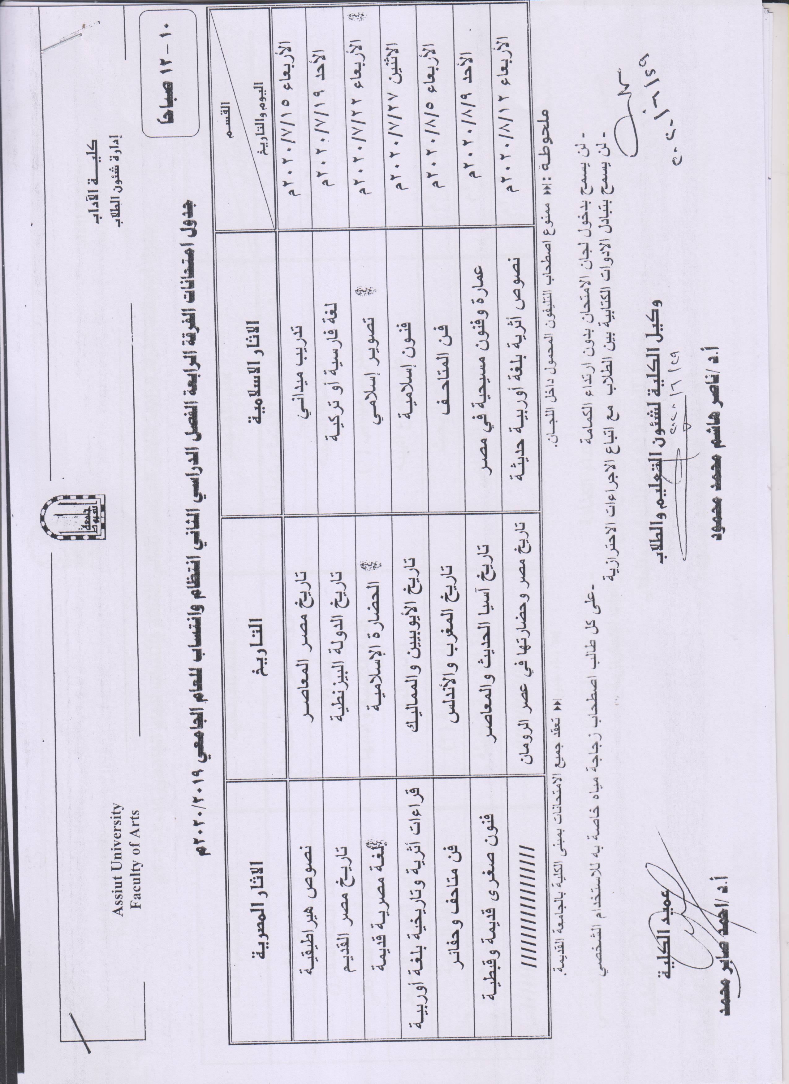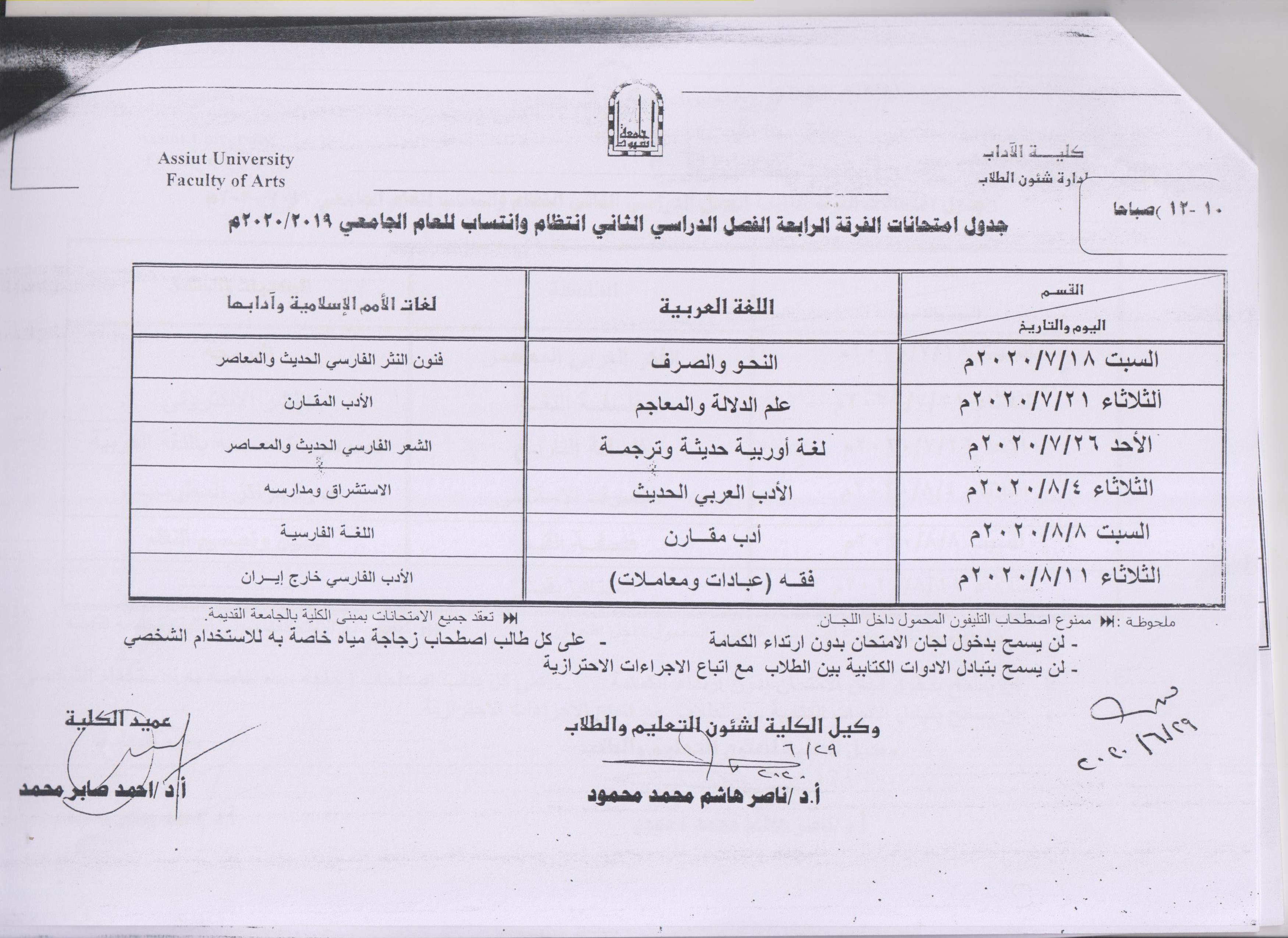 جدول امتحانات الفرقة الرابعة