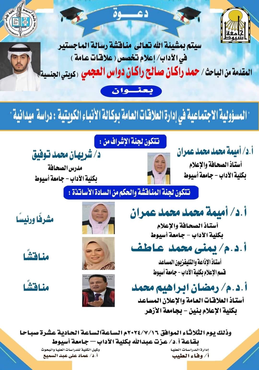 ومن جانبه؛ أشاد الدكتور أحمد عبد المولى؛ بمهرجان مشروعات التخرج لطلاب قسم الإعلام بكلية الآداب بجامعة أسيوط، والمشروعات التي تميزت بالواقعية، والتعبير الصادق عن الإنجازات التي يشهدها وطننا الغالي مصر؛ في عهد فخامة رئيس الجمهورية الرئيس عبد الفتاح السيسى رئيس الجمهورية؛ موجهاً الشكر للخريجين؛ لما بذلوه من مجهود منذ التحاقهم بالفرقة الأولى، و حتى وصولهم لتلك اللحظة.