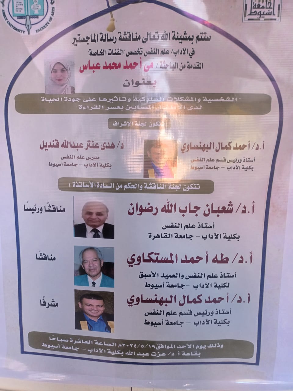 مجلس كلية الاداب يوافق علي منح الباحث الشيماء محمد عبدالعزيز درجة الماجستير في الاداب / علم نفس