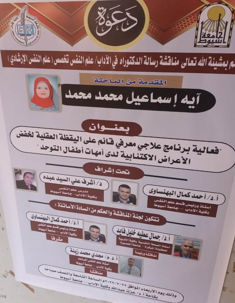 مجلس الكلية يوافق علي منح الباحثة بدرية عبدالمالك محمد درجةالدكتوراة في الاداب علم نفس تخصص فئات خاصة بتقدير عام مرتبة الشرف الاولي