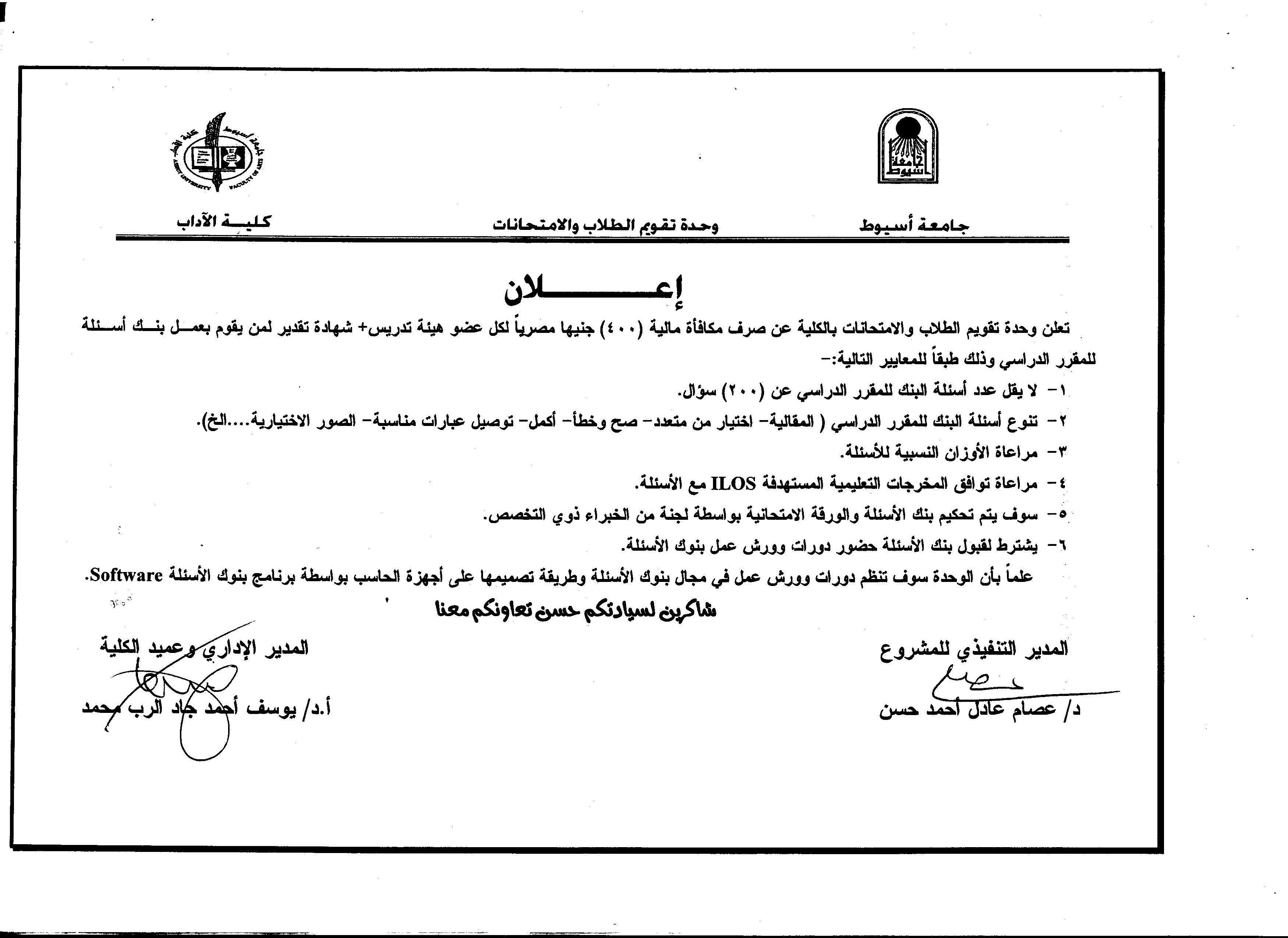 اعلان هام للسادة أعضاء هيئة التدريس خاص بعمل بنك أسئلة لكل مقرر دراسي