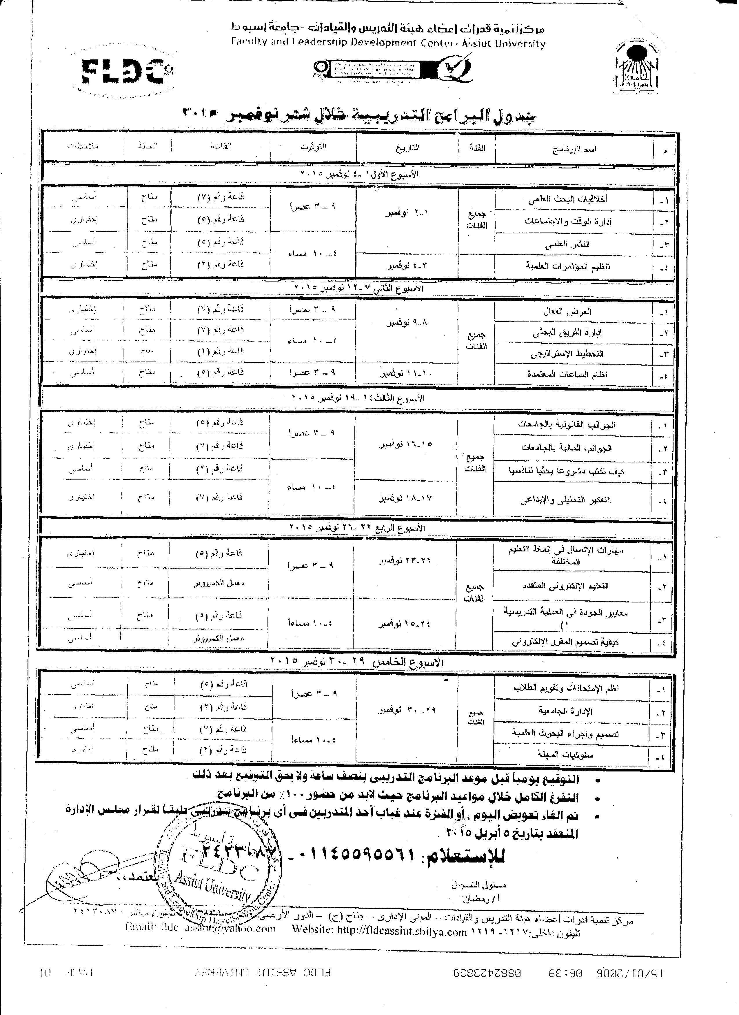في اطار تنفيذ البرامج التدريبية لمركز تنمية قدرات اعضاء هيئة لاتدريس والقيادات يعلن المركز عن جدول البرامج التدريبية لشهر نوفمبر 2015 للاستعلام 01145595561