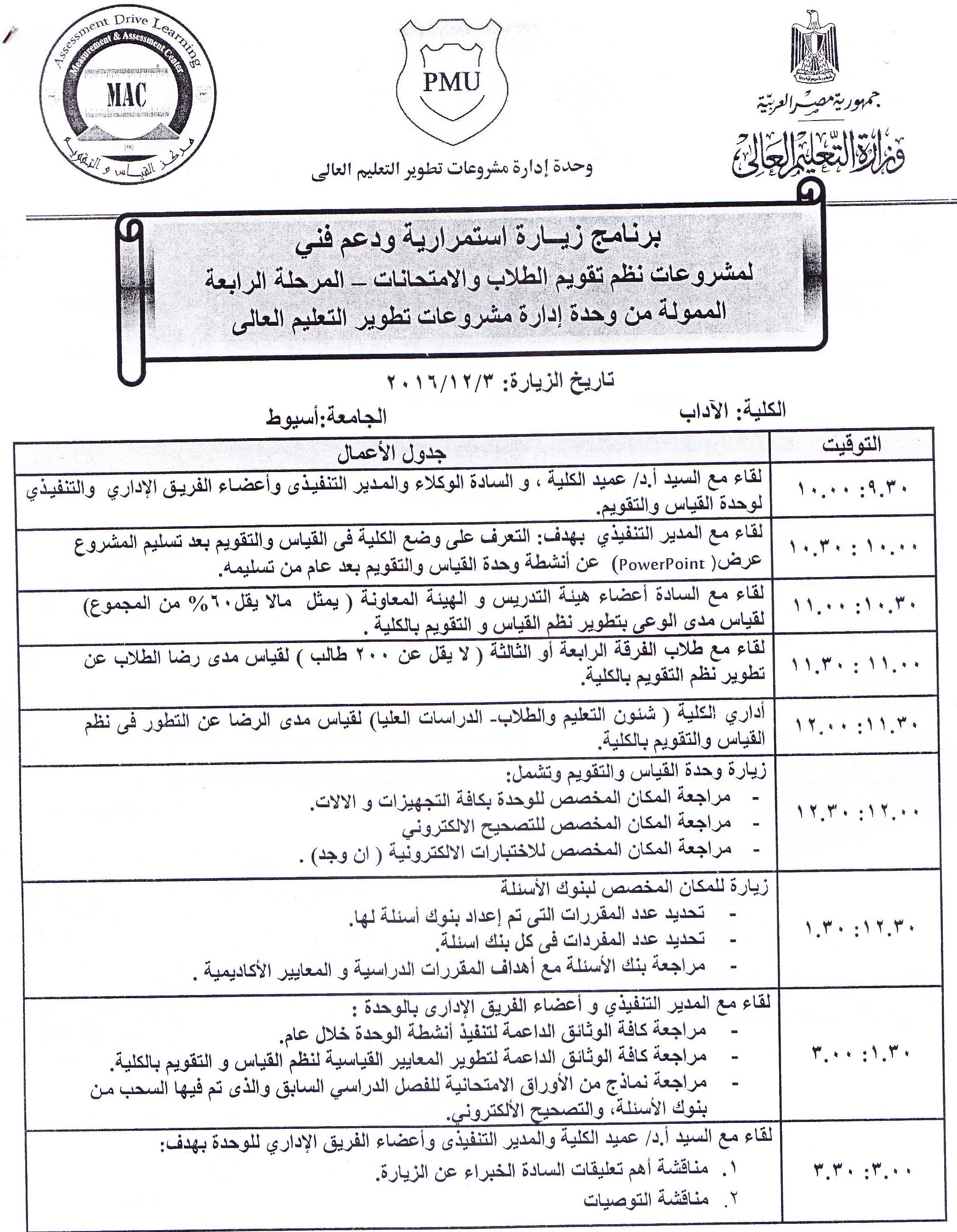 برنامج زيارة استمرارية ودعم فني لمشروعات نظم تقويم الطلاب والامتحانات كلية الآداب جامعة اسيوط 29 نوفمبر 2016 برنامج زيارة استمرارية ودعم فني لمشروعات نظم تقويم الطلاب والامتحانات كلية الآداب جامعة اسيوط