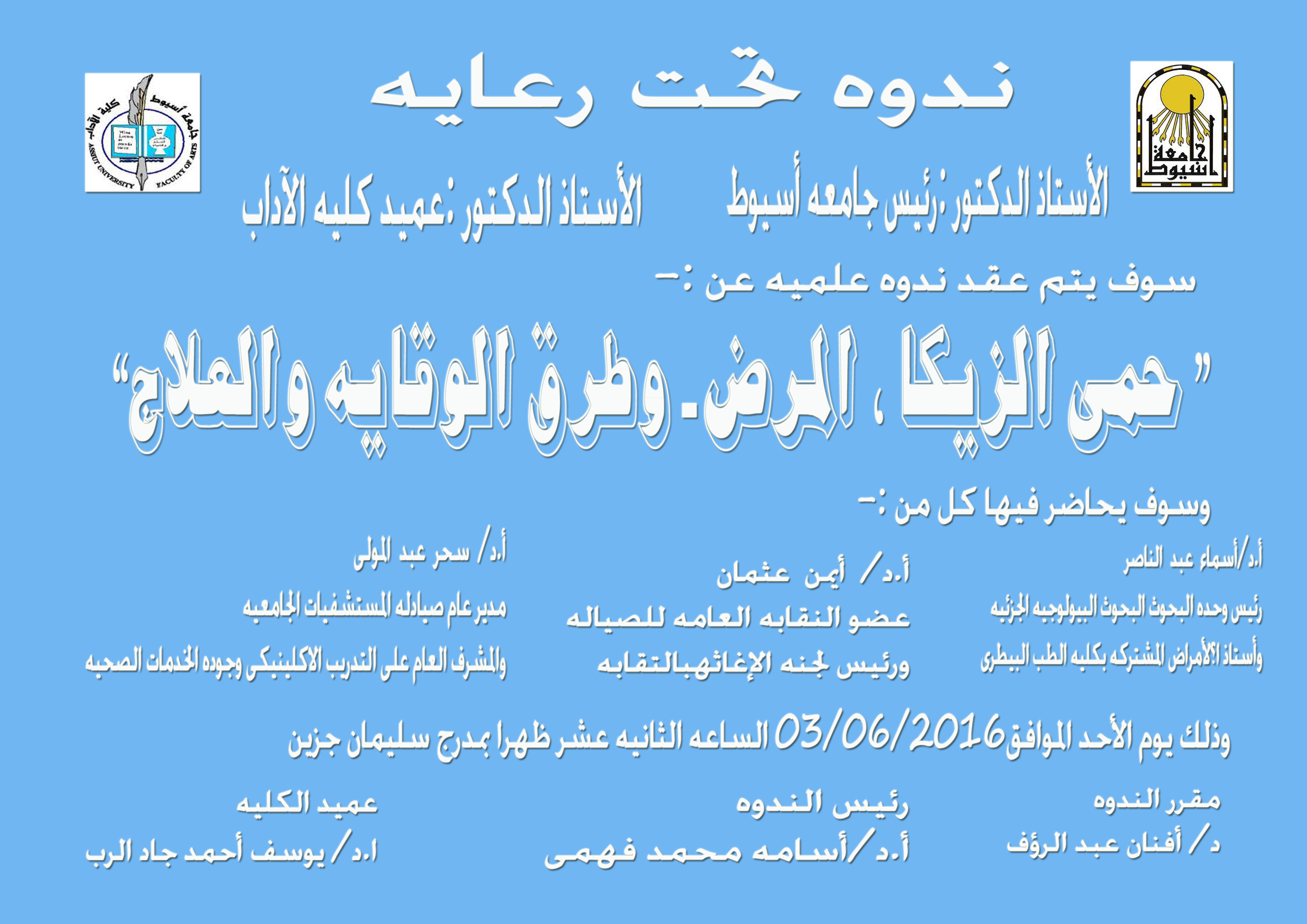 دعوة عامة لحضور ندوة بعنوان حمى زيكا برئاسة الاستاذ الدكتور يوسف أحمد جاد الرب عميد الكلية 2 مارس 2016 تنظم كلية الآداب بالتعاون مع قطاع خدمة المجتمع وتنمية البيئة ندوة علمية بعنوان حمى زيكا وذلك يوم الاحد 6/3/2016 الثانية عشرة ظهرا بمدرج سليمان حزين