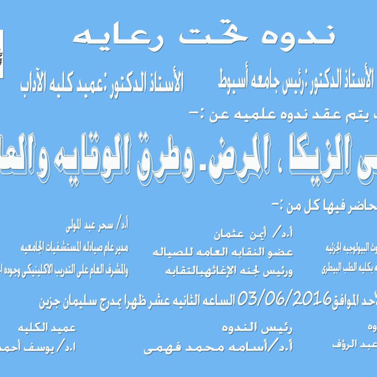 دعوة عامة لحضور ندوة بعنوان حمى زيكا برئاسة الاستاذ الدكتور يوسف أحمد جاد الرب عميد الكلية