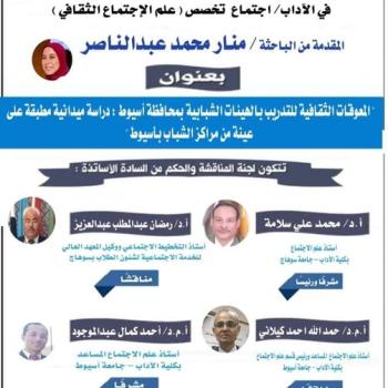جلسة مناقشة رسالة الماجستير في الاداب تخصص اجتماع / علم الاجتماع الثقافي للباحثة منار محمد عبد الناصر