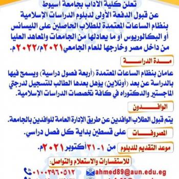 تعلن كلية الآداب عن قبول الدفعة الاولي لدبلوم الدراسات الاسلامية بنظام الساعات المعتمدة للطلاب الحاصلين علي الليسانس او البكالوريوس او مايعادلها من الجامعات من داخل مصر او خارجها