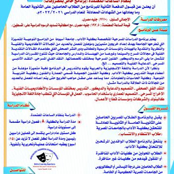 يسر برنامج الدراسات المسرحية المتخصصة بنظام الساعات المعتمدة عن قبول الدفعة الثانية للبرنامج من الطلاب الحاصلين على الثانوية العامة وما يعادلها من الشهادات المعادلة للعام الدراسى 2021/2022م