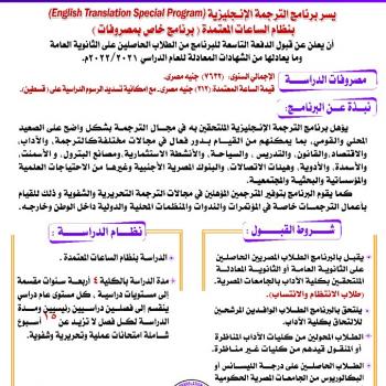 يسر برنامج الترجمة الإنجليزية بنظام الساعات المعتمدة عن قبول الدفعة التاسعة للبرنامج من الطلاب الحاصلين على الثانوية العامة وما يعادلها من الشهادات المعادلة للعام الدراسى 2021/2022