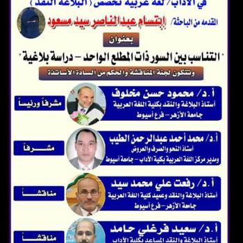يعقد اليوم بكلية الاداب جلسة مناقشة رسالة الماجستير في الآداب/ لغة عربية تخصص البلاغة والنقد المقدمة من الباحثة ابتسام عبدالناصر سيد مسعود