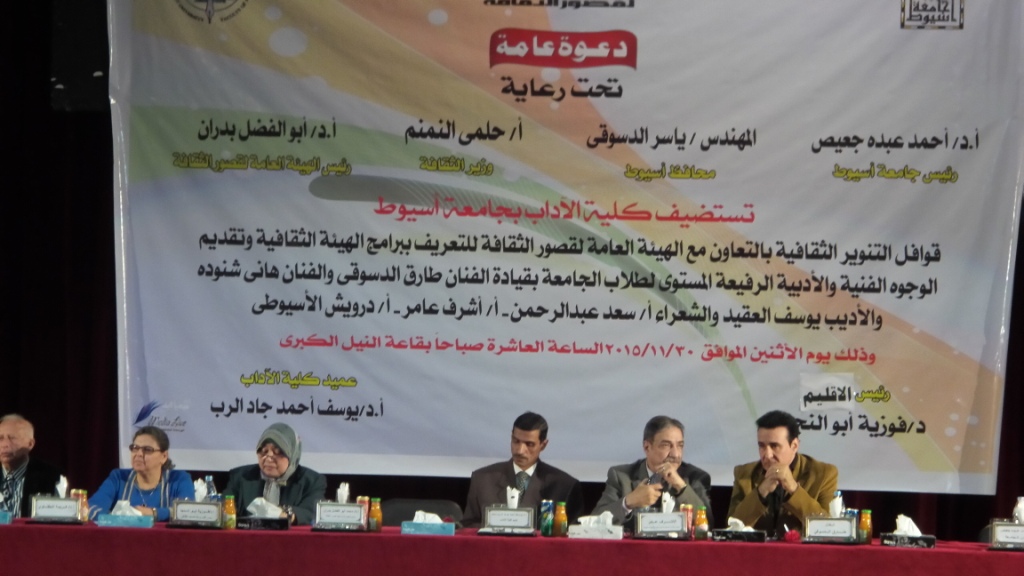 استضافت اليوم كلية الآداب تحت رعاية أ.د. عميد الكلية .ا.د رئيس الجامعة والسيد المهندس محافظ أسيوط قوافل التنوير الثقافية بالتعاون مع الهيئة العامة لقصور الثقافة للتعريف ببرامج الهيئة الثقافية وقد شارك في الحفل كل من الفنان طارق الدسوقي والفنان هاني شنوده والاديب يوسف القعيد والشعراء كل من سعد عبد الرحمن و أشرف عامر و درويش الاسيوطي وذلك بقاعة النيل بمبنى الجامعة الاداري